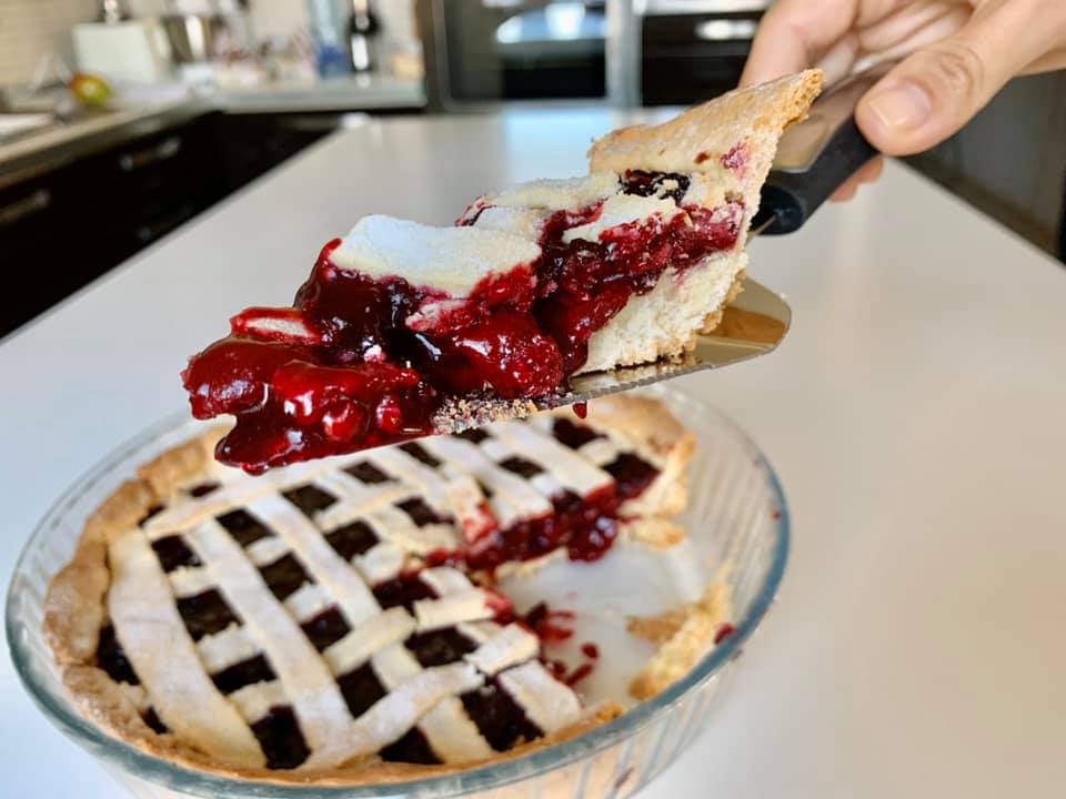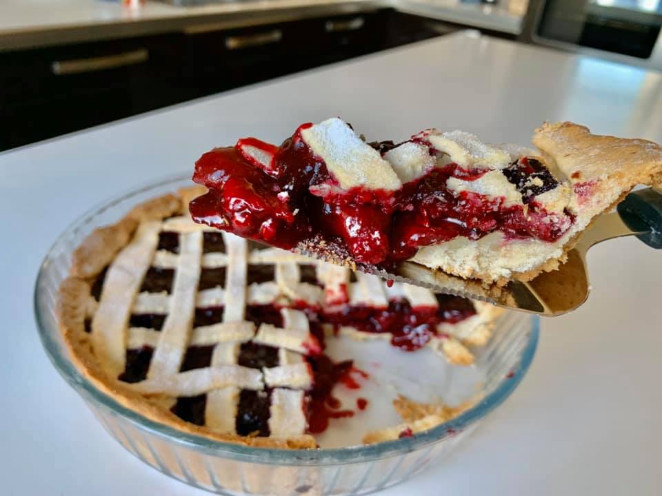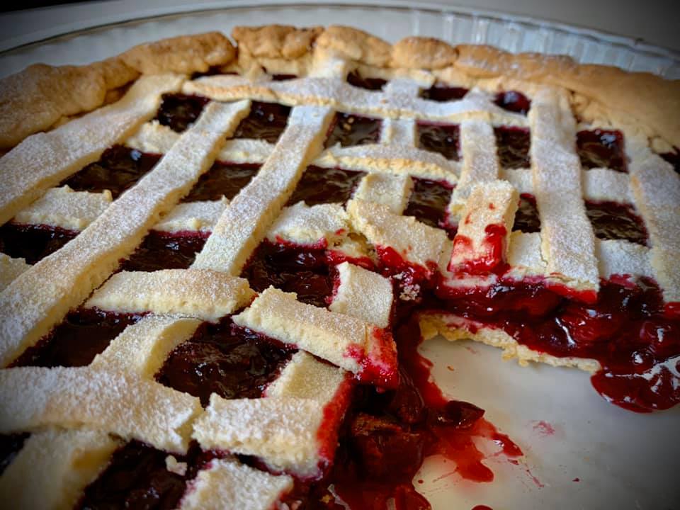 A, începusem de la tarta de vișine. Iat-o! Posibil să vă plouă în gură, știu. Aveți bonus și REȚETA full de tartă, normal, că doar n-o să mă îngraș numai eu. E asta de aici (CLICK LINK), însă puneți 1 kilogram de vișine, în loc de mere și caise, plus zahăr după gust. Se găsesc vișine congelate peste tot și dau așa un gust bun tartei.