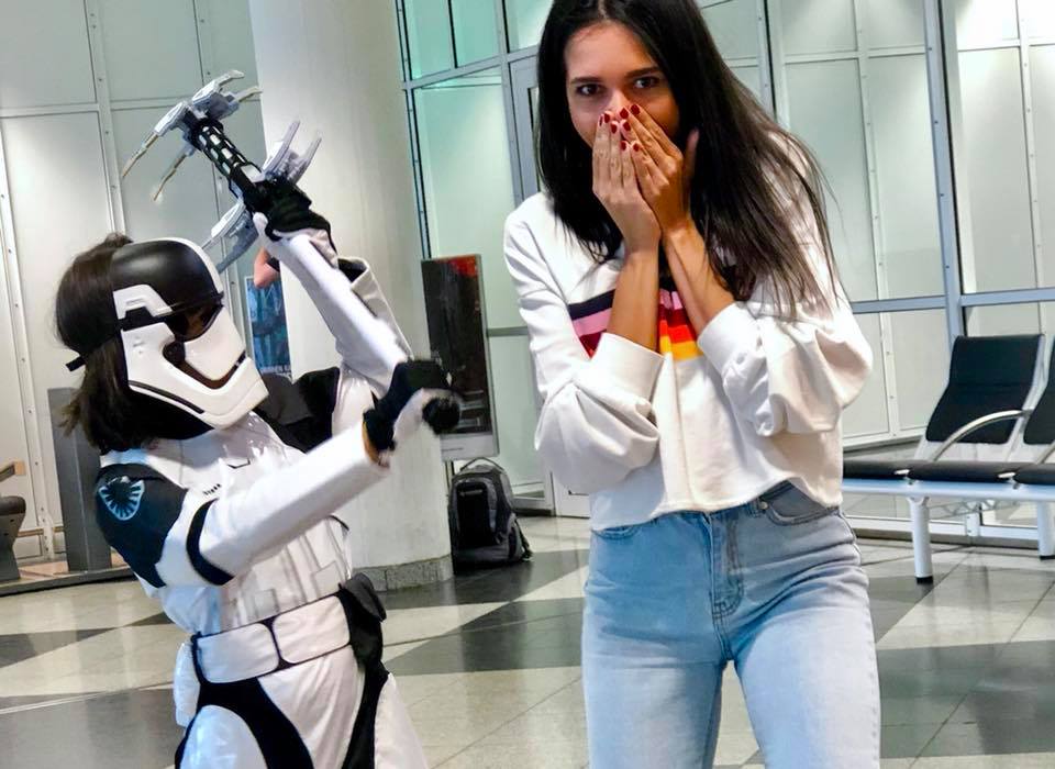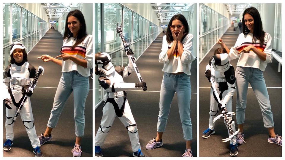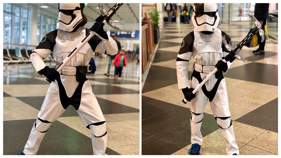 Si daca tot devenise Stormtrooper, nu a renuntat la costum sau la arma nici pe drumul cu avionul spre casa.