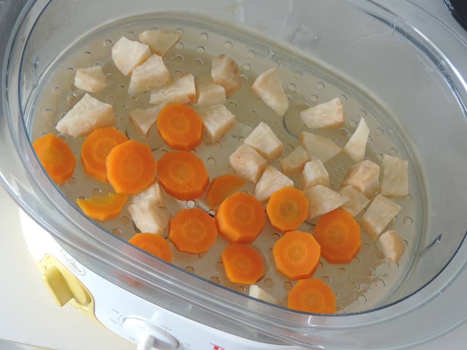 In ziua a treia, pe langa morcovi i-am adaugat si telina in piure. Totul gatit la aburi. As fi ales radacina de patrunjel, dar n-am gasit varianta bio pe moment, asa ca m-am multumit cu telina. Si nici n-am asteptat sa treaca patru zile pana la introducerea unui nou aliment, insa am simtit ca e ok pentru el sa procedez asa si oricum n-ar fi prima regula pe care o incalc sau o adaptez din mers. Noua mancare i-a placut si nu prea. Adica a mancat, dar fara prea mare pofta si chiar incepuse sa-mi para rau de toata situatia asta. Ma uitam la piciorusele lui pufoase si-mi era teama ca nu vor mai ramane asa…doar copanelele astea dulci se intretin cu ceva efort.