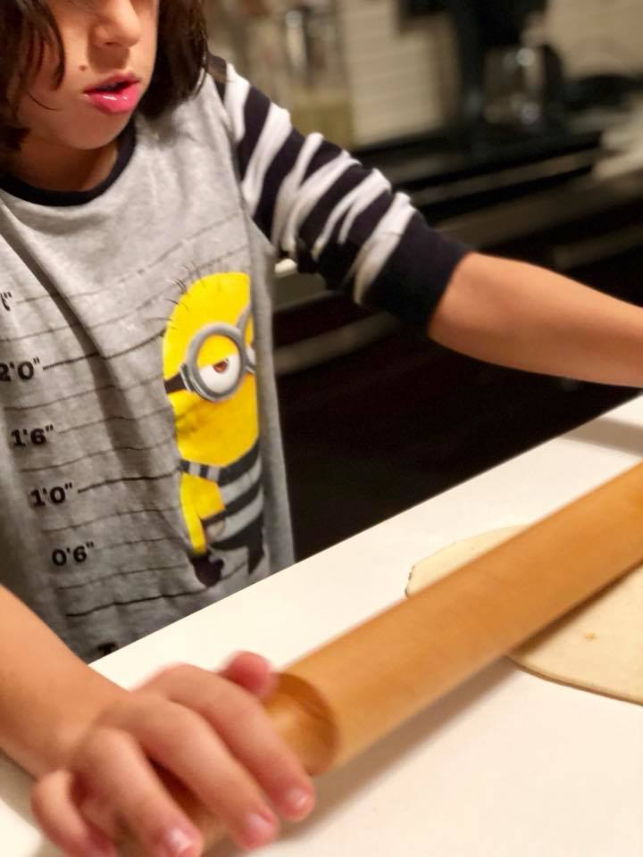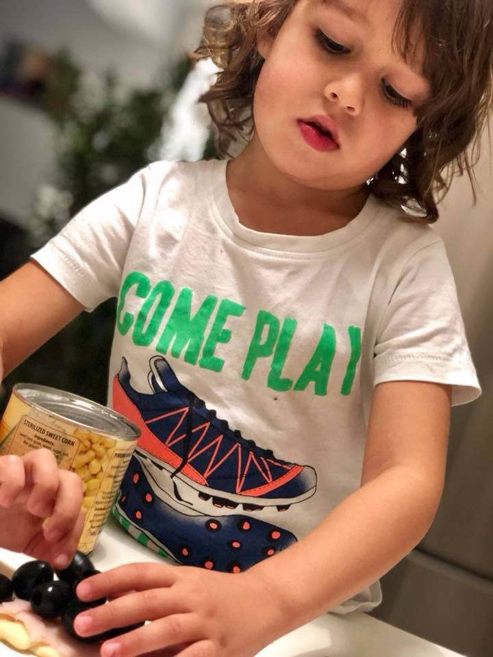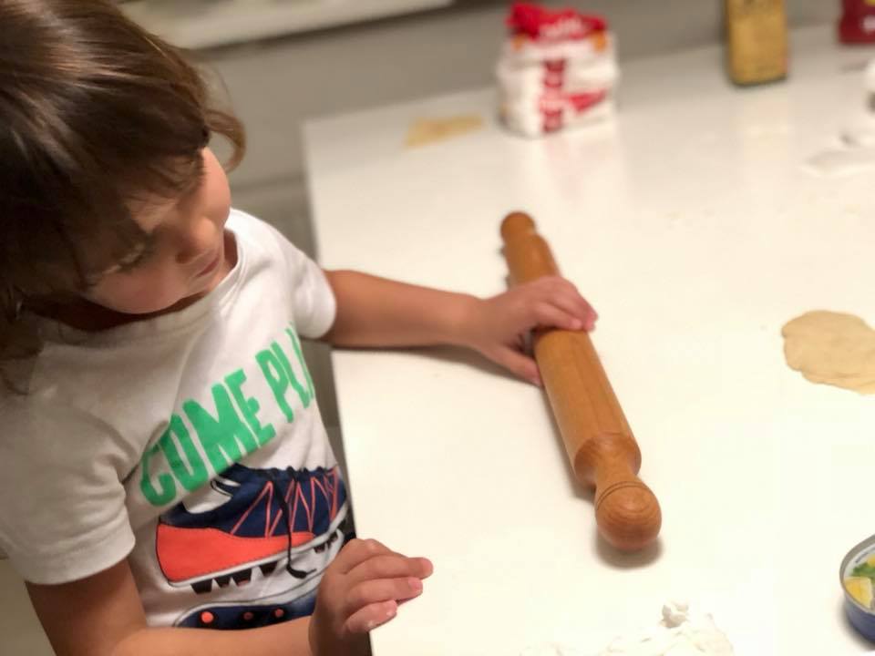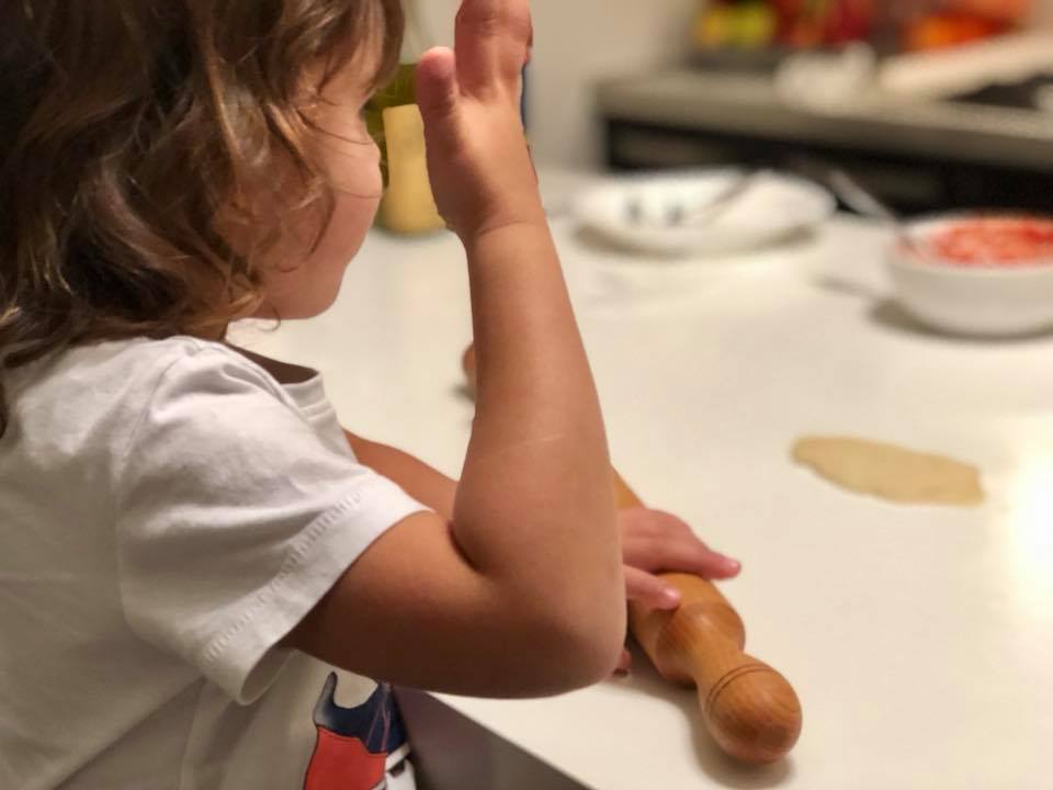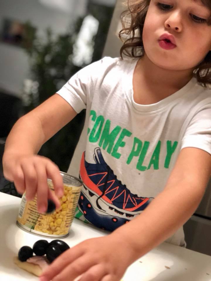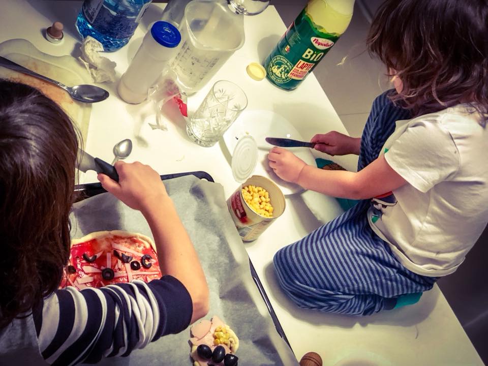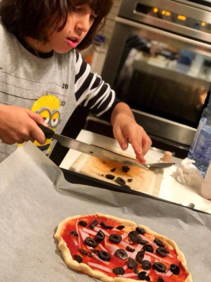 Macar am incheiat ziua frumos, am facut toti trei pizza. Tot mi-am propus eu sa dau jos vreo doua kilograme, numai bine mi-a picat sa mananc, la ceas de seara, o bucata de pizza cat capul meu. Si-acum ma apar si spun ca au cerut copiii. Ma rog, ei mi-au cerut sa le fac, nu sa si rad tot, cot la cot cu ei, si ceva peste. Scumpii, asa m-au ajutat. I-am lasat sa isi faca ce au vrut acolo, ce combinatii le-au trecut prin cap. Au framantat aluatul, au taiat singuri ingredientele(si lui Aris i-am lasat un cutit mic), asa drag imi e sa ii vad implicati, dornici sa ma ajute.