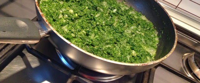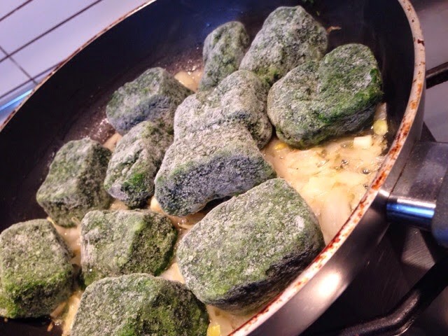 Am taiat ceapa marunt si am calit-o putin in 50 gr unt. Am adaugat apoi spanacul congelat, iar dupa ce s-a dezghetat am mai pus 200 ml lapte si am lasat pe foc aproximativ 10 minute; am potrivit de sare si piper, am mai adaugat 1/2 lingura nucsoara.