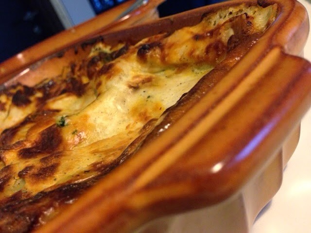 Am topit aproximativ 100 gr unt, am adugat 3 linguri de faina si am rumenit-o putin, apoi am turnat treptat, amestecand continuu cu telul, 1 l lapte fierbinte. La final am mai adaugat si 100 gr parmezan in sos, 1/2 lingura de nucsoara, sare, piper.