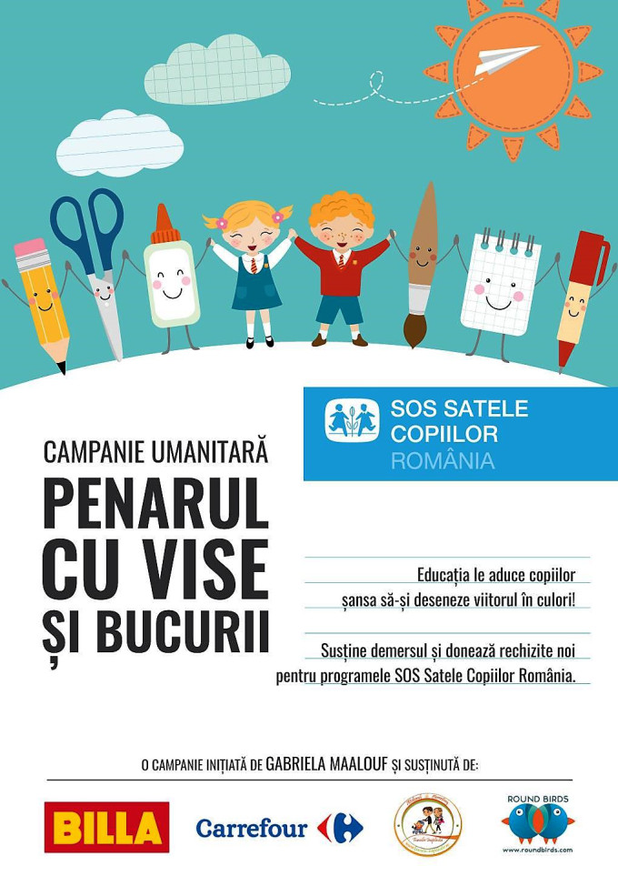 In perioada 1-8 septembrie 2016, Gabriela Maalouf, expert parenting si programare neurolingvistica, desfasoara impreuna cu Billa Romania și Carrefour Romania, campania umanitara „Penarul cu Vise si Bucurii”, cu obiectivul de a strange si de a darui rechizite noi la începutul anului scolar pentru copiii beneficiari ai programelor SOS Satele Copiilor România.