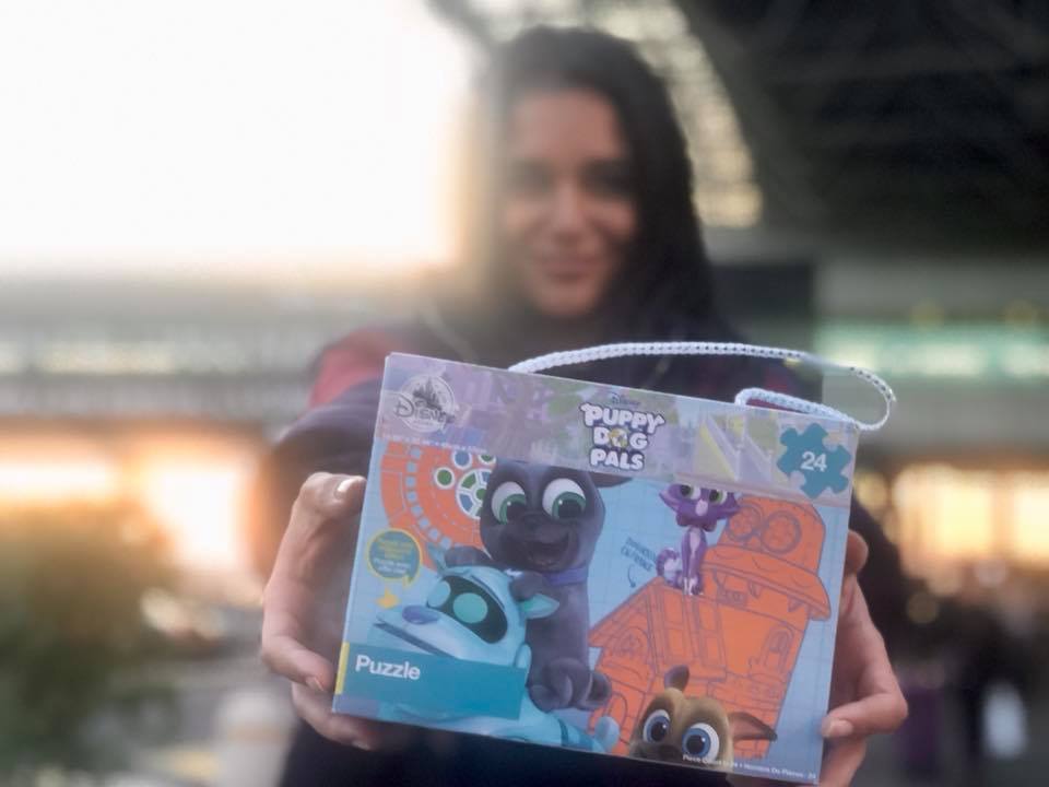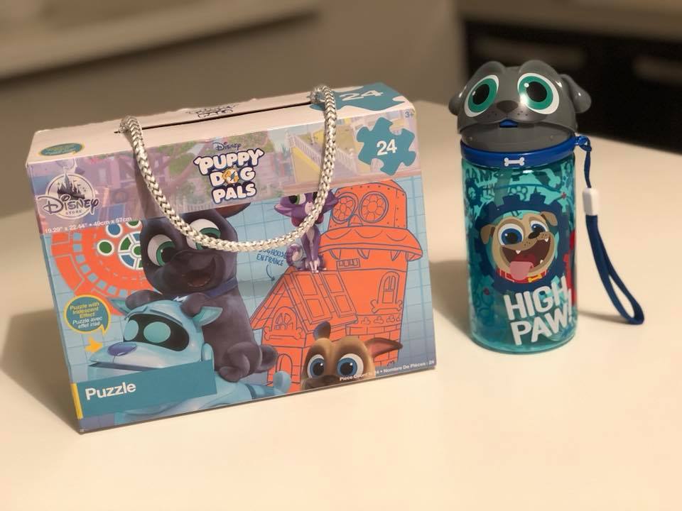 Am doua mici cadouri pentru doi dintre puii vostri. Un puzzle si o sticla pentru apa, ambele cu Prietenii catelusi. Le-am cumparat din magazinul Disney din Roma. Daca va amintiti puzzle-ul cu Mickey Mouse pe care l-am adus data trecuta si care stiu ca v-a incantat, asta e acelasi gen. Sticla de apa, recunosc, era cadoul nostru pentru Aris, numai ca pufosul e acum fan Patrula catelusilor si eu am incurcat borcanele. Nu mi s-a parut prea entuziasmat cand i-am oferit sticluta, asa ca prefer sa i-o trimit unui dintre puii vostri, sigur se lasa cu mai multa bucurie. Pentru Aris al meu am dat fuga la PEPCO si i-am cumparat o macara pe care pusese ochii de ceva timp. E ca si cum i-as fi luat-o din Roma, important e ca nu a ramas nemultumit.