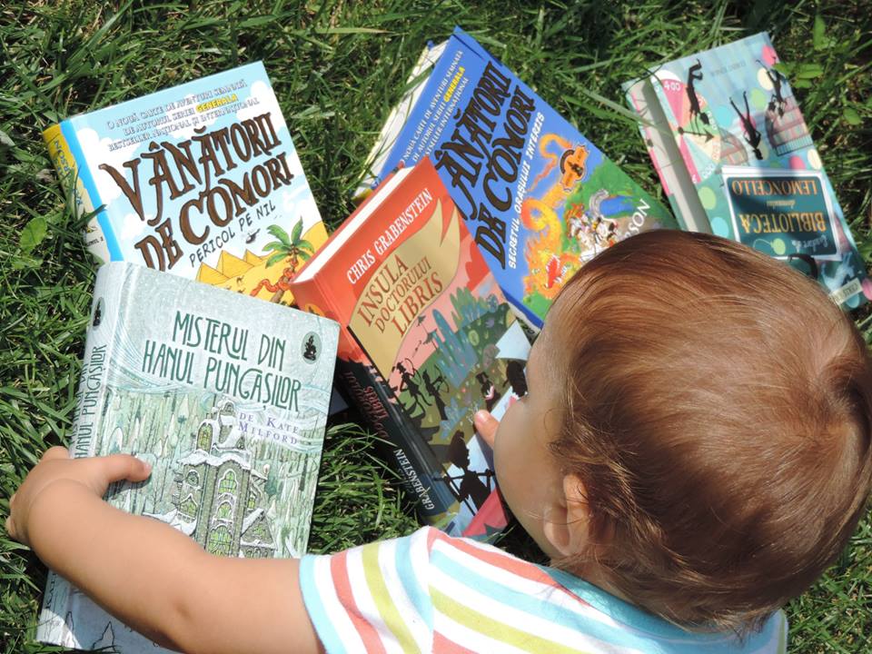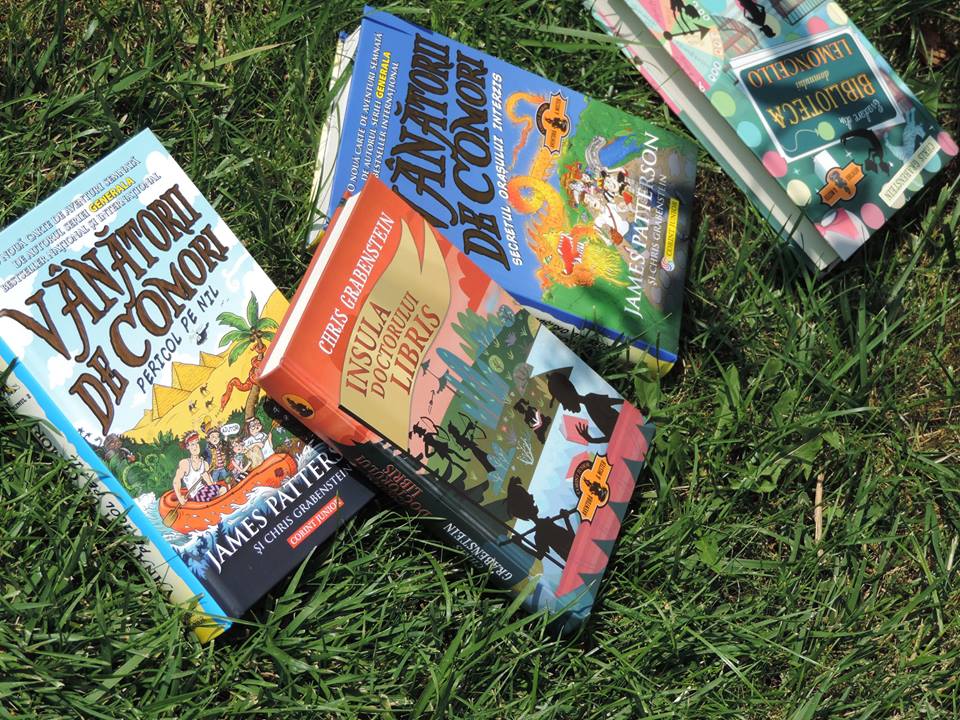 Cand i-a ajuns pachetul cu cele 8 volume, a fost tare incantat! Le-a cercetat cu atentie si mi-a spus ca ii plac semnele de carte si desenele de pe coperti. Apoi, a inceput sa citeasca titlurile cu voce tare: „Misterul din Hanul Pungasilor”, „Insula Doctorului Libris”, „Evadare din biblioteca domnului Lemoncello”, „Nesfarsita goana dupa elefant”, „Uluitorul Broccoli Boy”, „Vanatorii de comori volumul I, „Vânătorii de comori volumul II – Pericol pe Nil”, „Vânătorii de comori volumul III – Secretul orasului interzis.”